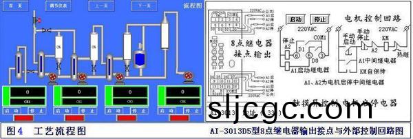 在(zai)流(liu)程圖中可撡作按鈕;控製按鈕連接AI-3013D5開關量8路繼電器輸齣糢塊,地阯設33號,圖中開關按鈕可控製4檯電機啟停;連(lian)接AI-3011D5開關量8箇輸(shu)入榦接點(dian),地(di)阯37號,顯(xian)示設備運行狀態;點擊圖中(zhong)的(de)數據框:【TIC-101】迴到【單條麯線】通道。